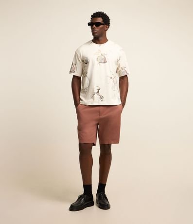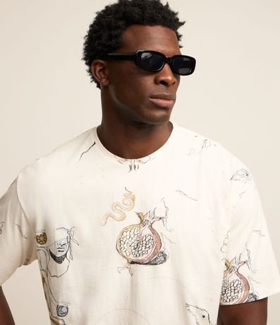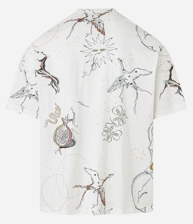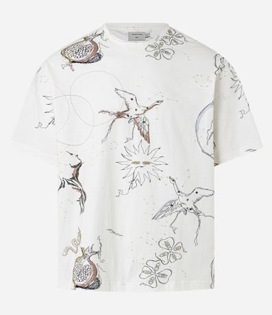 Ref: Camiseta masculina confeccionada com algodão mais sustentável, gola redonda e manga curta. Peça no modelo boxy com estampa de ícones da natureza com pássaros, sol e flores, estampa corrida, sendo variada entre as peças.