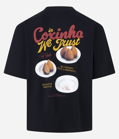 Camiseta masculina boxy em algodão traz estampa divertida de coxinhas, combinando humor e estilo em um visual moderno e descontraído.