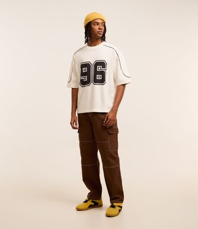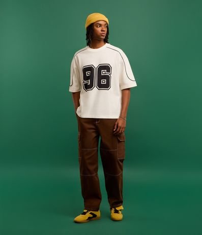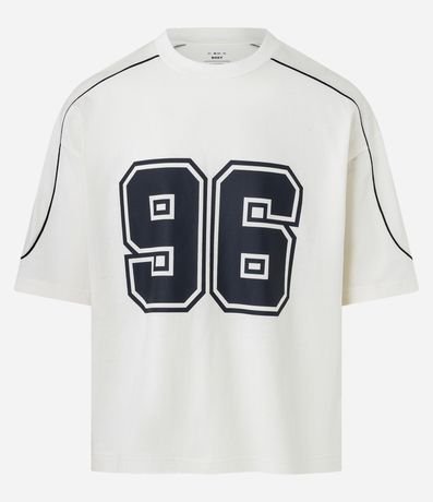 Ref: Camiseta masculina confeccionada em algodão mais sustentável, no modelo boxy, possui gola redonda, manga curta, estampa localizada "96" e detalhe contrastante.
