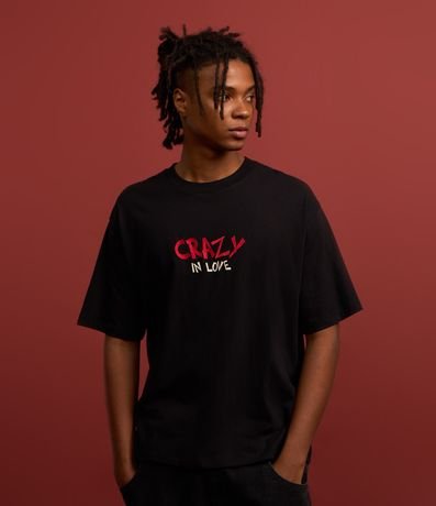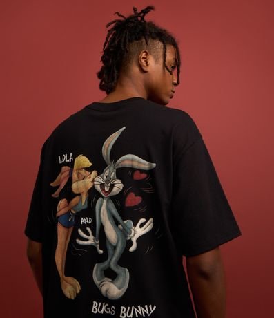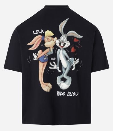 Ref: Camiseta masculina confeccionada em algodão mais sustentável, gola redonda, manga curta. Peça no modelo boxy com estampa fofa dos personagens Lola e Pernalonga com lettering crazy in love.