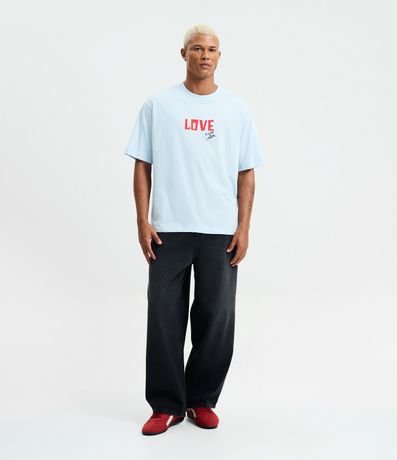 Camiseta masculina fit boxy confeccionada em algodão certificado BCI, através de boas práticas ambientais. Possui modelagem reta, com gola redonda e mangas curtas. A parte frontal apresenta estampa centralizada com lettering. Nas costas, há uma estampa colorida com desenho grande composto por formas circulares organizadas em formato de coração, além de uma pequena ilustração de casa abaixo.