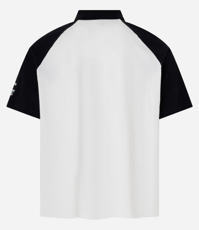 Camiseta boxy confeccionada em malha de algodão BCI. A blusa tem gola polo e mangas raglã contrastantes e estampa frontal "pre-seadon".
