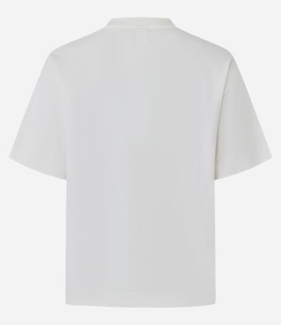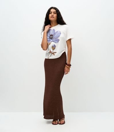 Camiseta feminina de modelo boxy, confeccionada em malha de algodão, com gola redonda e mangas curtas. Possui estampa frontal de flor com detalhes bordados.