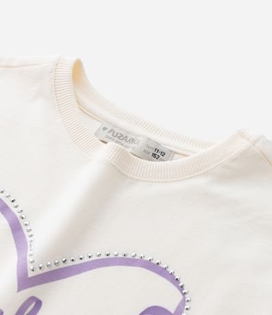 Camiseta infantil confeccionada em algodão mais sustentável através de boas práticas ambientais, no modelo boxy. Possui gola redonda, manga curta, estampa lettering "Girls Club", coração, laço e aplicação de strass.