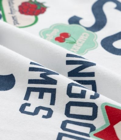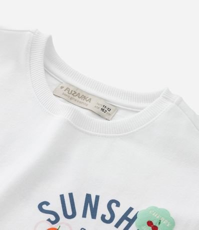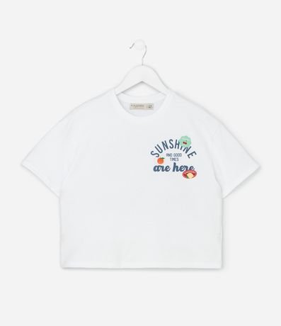 Ref: Camiseta infantil confeccionada em material e processo mais sustentáveis. Peça no modelo boxy, com gola redonda, manga curta e estampa frente e costas com lettering "Sunshine and good times are here".