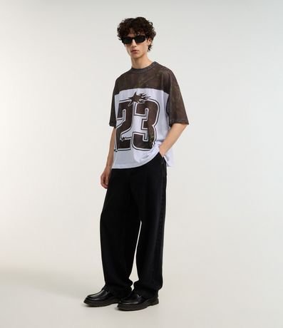 Camiseta masculina confeccionada em poliéster, no modelo comfort. Peça sportcore, possui gola redonda, manga curta, estampa abstrata  e estampa lettering "23".