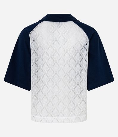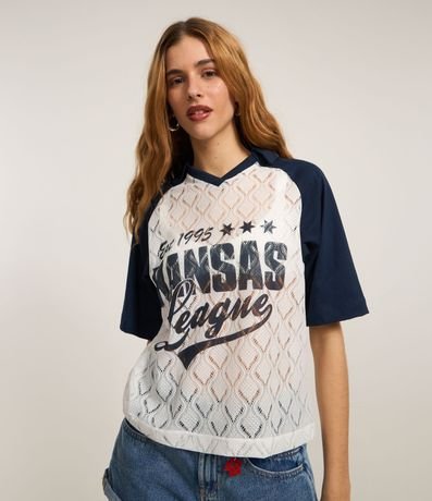 Ref: Camiseta de renda, estilo colegial, com gola V, mangas curtas, cavas raglan e estampa frontal Kansas.