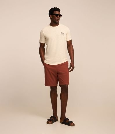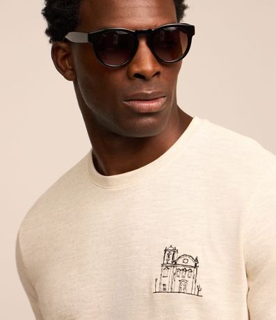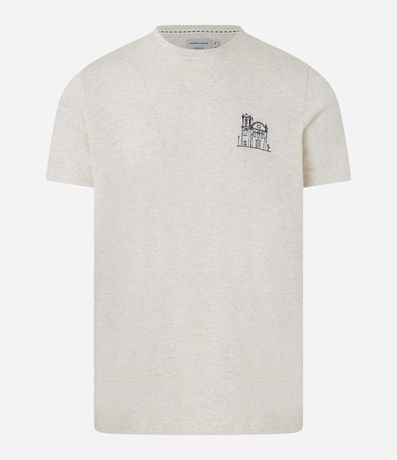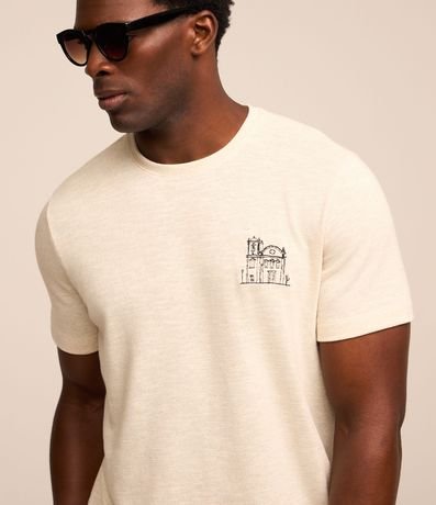 Camiseta masculina, com gola redonda, manga curta. Peça contém estampa localizada e nas costas estampa de cidade histórica.