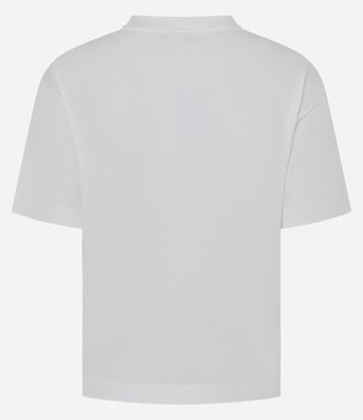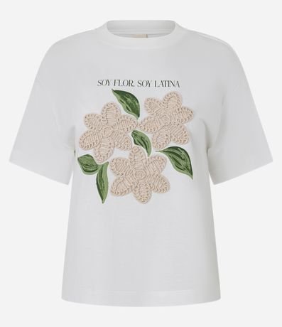 Camiseta feminina confeccionada em meia malha de algodão, com gola redonda e manga curta. Possui estampa localizada com aplicação de flores em relevo, trazendo delicadeza e charme ao visual. Ideal para compor looks casuais, confeccionada em algodão de certificado BCI.
