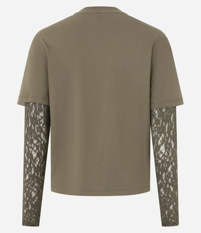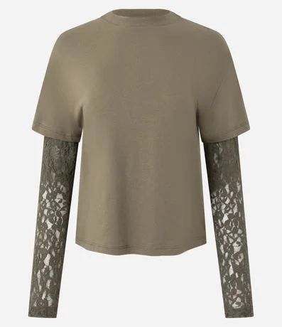 Ref: Camiseta feminina confeccionada em meia malha de algodão mais sustentável, com acabamento liso e caimento confortável. O modelo apresenta gola redonda e corpo de t-shirt com manga curta, combinado a mangas longas em renda aplicada por baixo, criando efeito de sobreposição que adiciona textura e sofisticação ao visual. A peça une o conforto da malha ao charme delicado da renda, sendo ideal para composições fashion que transitam entre o casual e o elegante.