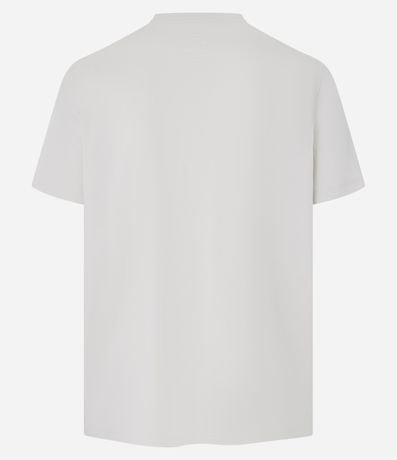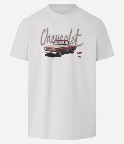 Camiseta masculina confeccionada em algodão mais sustentável com boas práticas ambientais no modelo comfort, possui gola redonda, manga curta e estampa de picape Chevrolet.