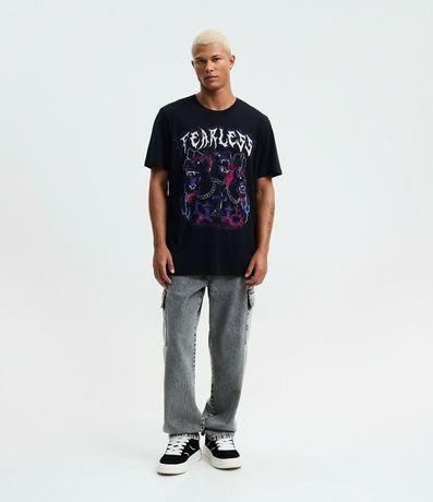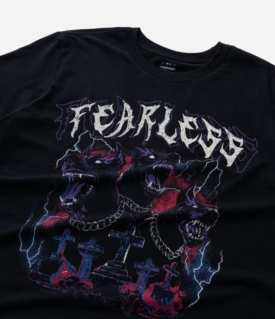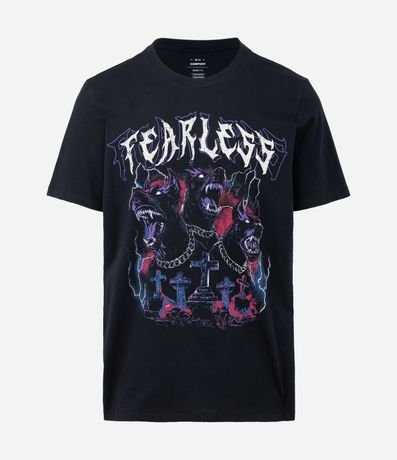 Ref: Camiseta masculina no modelo comfort em algodão mais sustentável, de certificado BCI. A peça possui mangas curtas, gola redonda, estampa com cachorro e lettering Fearless.