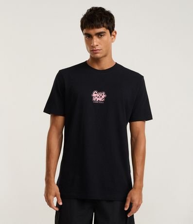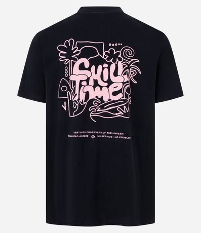 Camiseta masculina confeccionada em algodão certificado BCI e boas práticas ambientais. Modelo comfort com gola redonda e mangas curtas. Estampa lettering Chill Time Psicodélica aplicada na frente e costas.