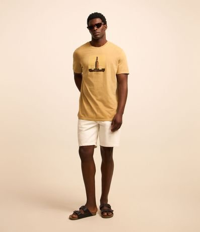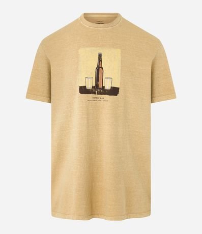 Ref: Camiseta masculina, modelo comfort, confeccionado em algodão mais sustentável, gola redonda, manga curta. Peça com estampa centralizada de uma garrafa de cerveja e dois copos representando um brinde de boteco.