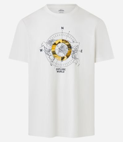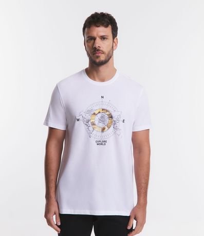 Ref: Camiseta masculina confeccionada em algodão mais sustentável com boas práticas ambientais no modelo comfort. Possui gola redonda, manga curta e estampa de bússola.