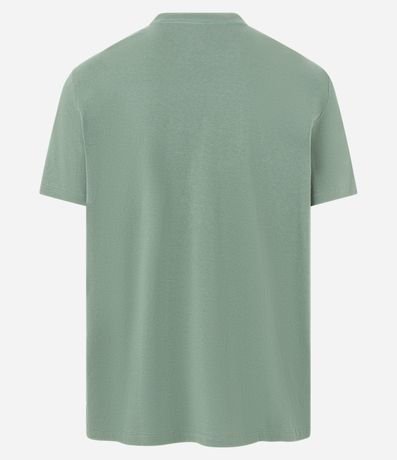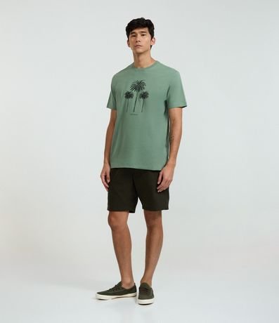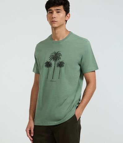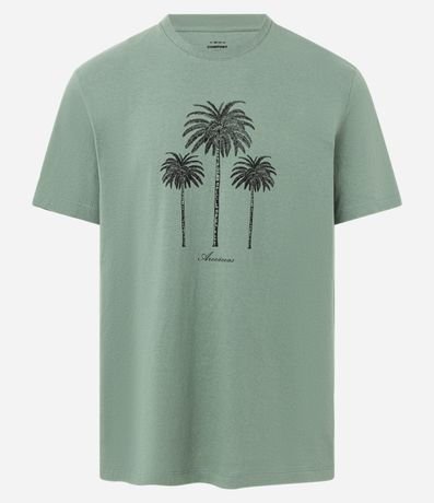 Ref: Camiseta masculina confeccionada com boas práticas ambientais. Peça no modelo comfort, gola redonda, manga curta com estampa de coqueiros.