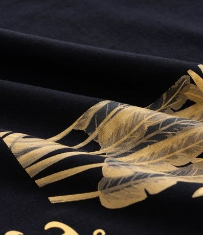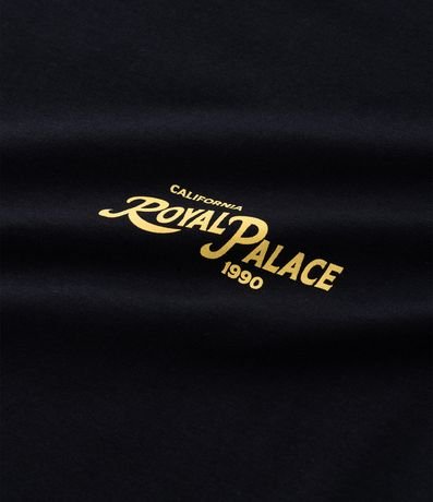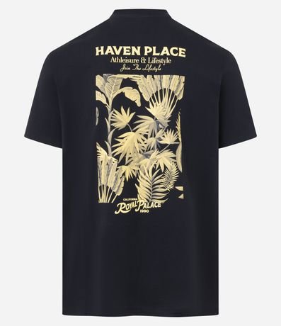 Ref: Camiseta masculina confeccionada em algodão certificado BCI e boas práticas ambientais. Modelo comfort com gola redonda e mangas curtas. Estampa lettering com folhagem Royal Palace aplicada na frente e costas para um visual sofisticado.
