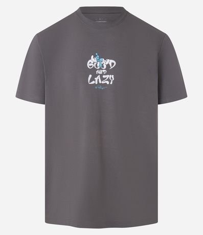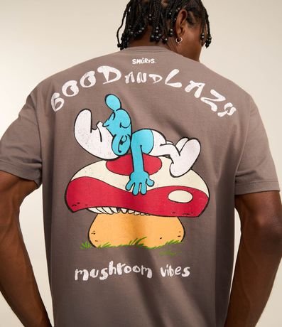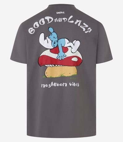 Ref: Camiseta masculina confeccionada em algodão mais sustentável com boas práticas ambientais no modelo comfort, possui gola redonda, manga curta, estampa lettering e estampa dos Smurfs.
