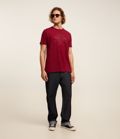 Camiseta masculina confeccionada em algodão mais sustentável com boas práticas ambientais em modelo comfort, possui gola redonda, manga curta e estampa lettering frontal "Pilsner Lager''.