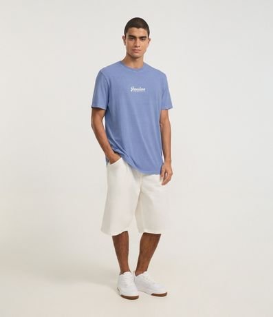 Ref: Camiseta masculina confeccionada em algodão mais sustentável através de boas práticas ambientais, no modelo comfort. Possui gola redonda, manga curta, estampa lettering "Pasadena" e estonada.