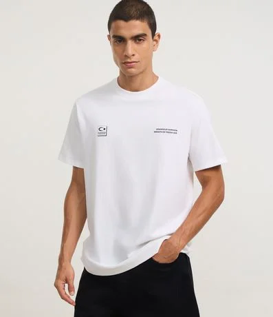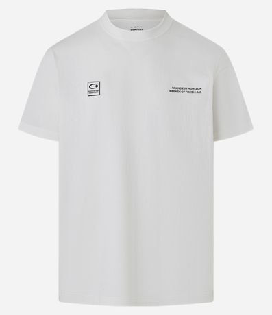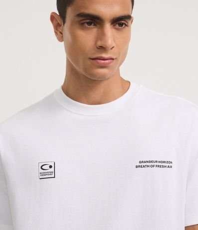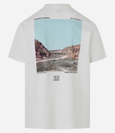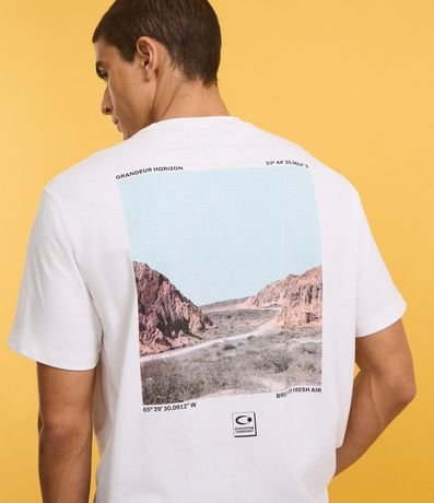 Ref: Camiseta confeccinada em malhão de algodão BCI. A t-shirt tem gola redonda, mangas curtas, estampa frontal lettering e estampa traseira de photoprint de paisagem.