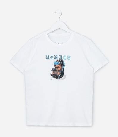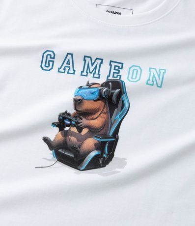 Ref: Camiseta infantil confeccionada em algodão mais sustentável através de boas práticas ambientais, no modelo comfort. Possui gola redonda, manga curta, estampa de capivara gamer e lettering "Game On".