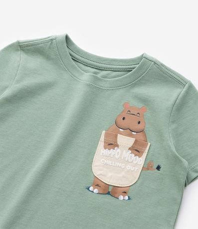Ref: Camiseta infantil confeccionada em malha de algodão mais responsável, com gola redonda e mangas curtas. Possui bolsinho frontal interativo, com estampa divertida de hipopótamo.