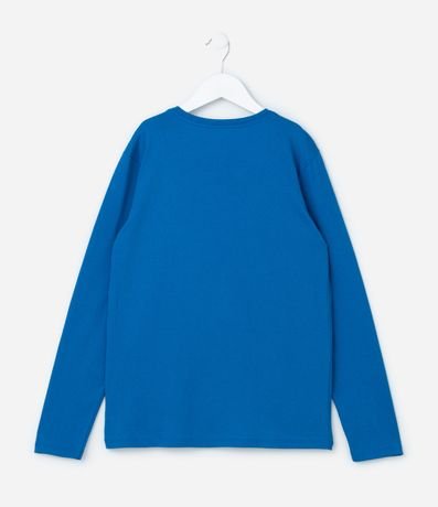 Camiseta infantil com gola redonda, mangas longas e estampa do Sonic. A peça é confeccionada com boas práticas ambientais e algodão certificado bci.