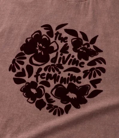 Camiseta cropped de algodão mais sustentável com gola redonda, mangas curtas e estampa frontal flocada "divine feminine", que significa "divino feminino" <3