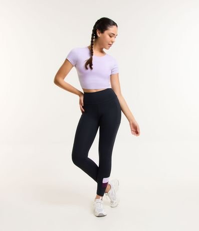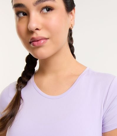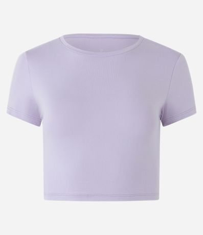 Camiseta cropped esportiva feminina, com gola redonda, mangas curtas e superfície sem estampa.