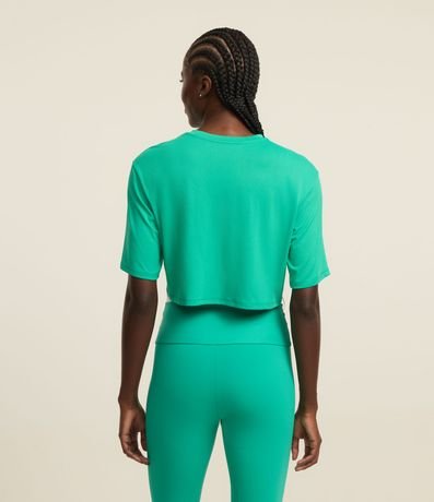 Camiseta feminina esportiva em poliamida, decote redondo, mangas curtas amplas, no modelo cropped com estampa lettering.