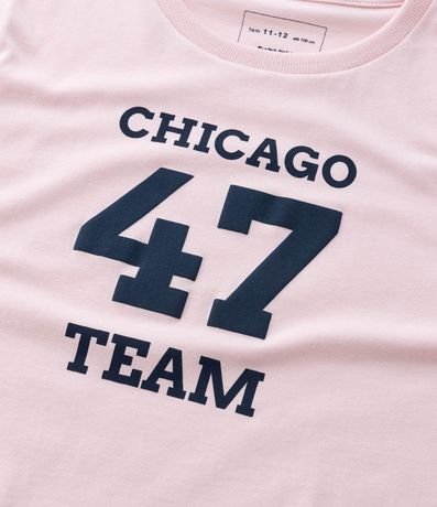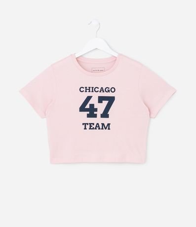 Camiseta infantil de modelo cropped confeccionada em algodão de material e processo mais sustentáveis. Possui gola redonda, manga curta e estampa lettering "Chicago 47  Team".