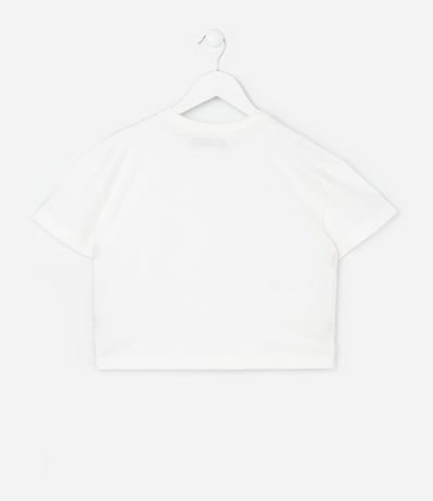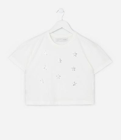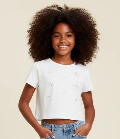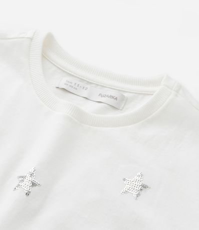 Ref: Camiseta infantil confeccionada com material e processo mais sustentável. De modelo curto, possui gola redonda, mangas curtas e bordado de estrelas em paetês.
