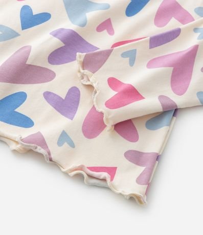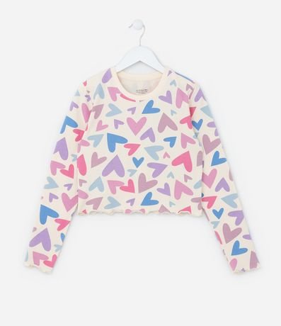 Camiseta infantil curta, confeccionada em algodão, com gola redonda, mangas longas e estampa de corações. Possui frufru nas bordas.