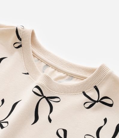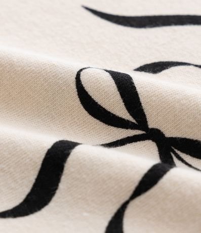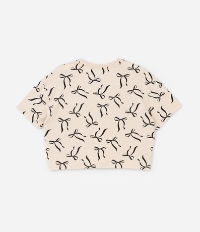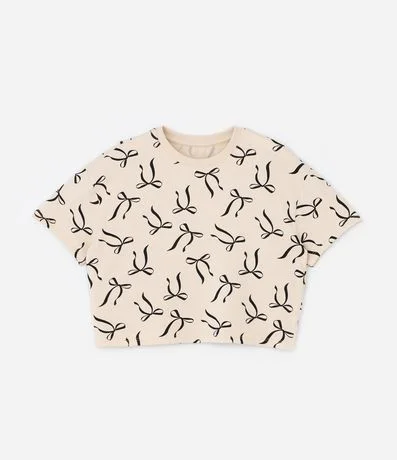 Ref: Camiseta curta infantil com gola redonda, mangas curtas e estampa de lacinhos. A peça é confeccionada com boas práticas ambientais e algodão certificado bci.