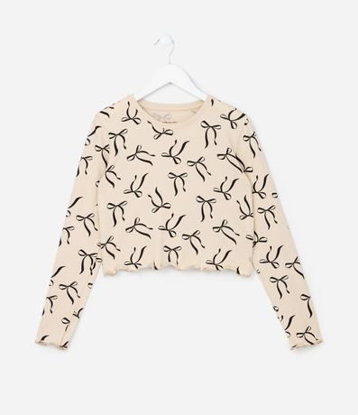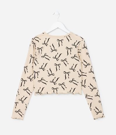 Camiseta infantil de modelo curta, com gola redonda, mangas longas, estampa de lacinhos e frufru nas bordas. A peça é confeccionada com boas práticas ambientais e algodão certificado bci.