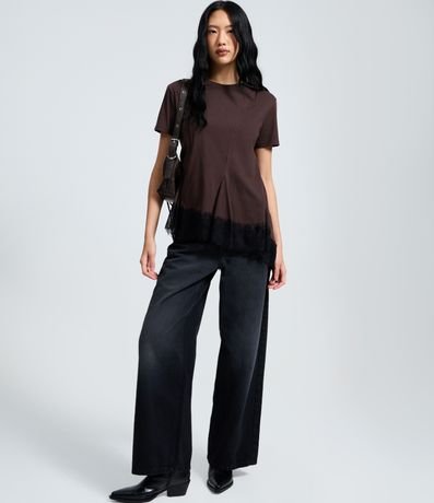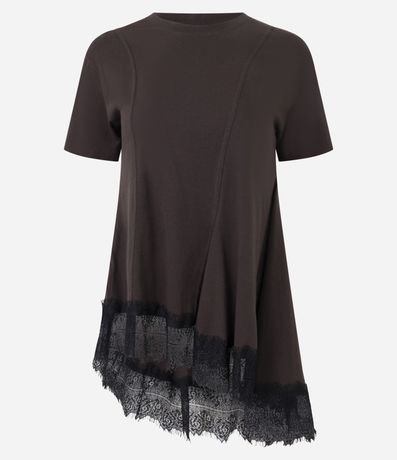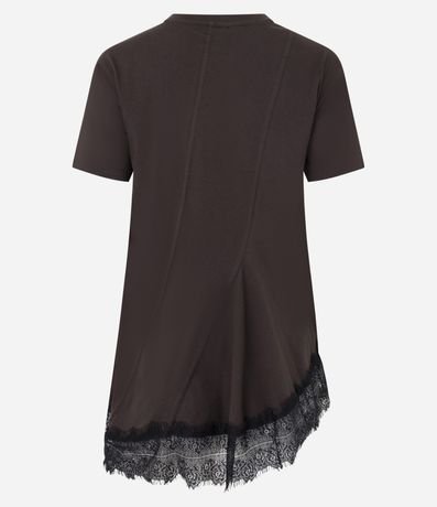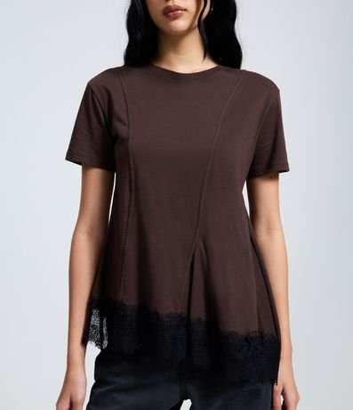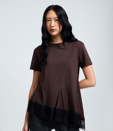 Ref: Blusa t-shirt feminina confeccionada em malha de algodão mais responsável, com gola redonda e mangas curtas. Possui costuras frontais, barra assimétrica e renda larga na finalização.