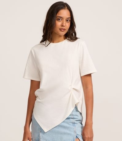 Ref: Camiseta feminina confeccionada em algodão mais sustentável. Possui gola redonda, manga curta, sem estampa, barra assimétrica e detalhe de torção lateral.