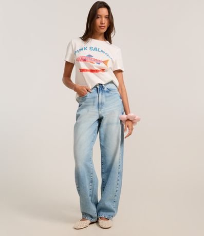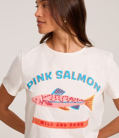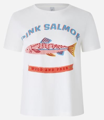 Camiseta manga curta, confeccionada em algodão bci mais sustentável e produzida através de boas práticas ambientais. Possui estampa em lettering Pink Salmon e peixe bordado.