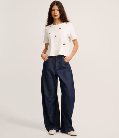 Camiseta feminina confeccionada em algodão certificado bci com boas práticas ambientais, no modelo t-shirt, gola redonda, manga curta e estampa bordada de cereja.