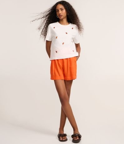 Ref: Camiseta feminina confeccionada em algodão certificado bci com boas práticas ambientais, peça com gola redonda, manga curta e estampa bordada de caju em paetês.