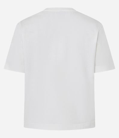 Camiseta feminina confeccionada em algodão certificado bci com boas práticas ambientais, peça com gola redonda, manga curta e estampa bordada de coqueiros em paetês.