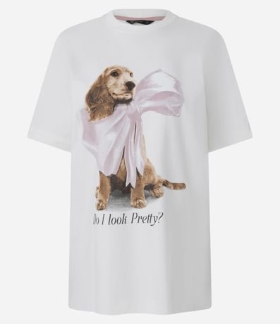 Camiseta de mangas curtas, confeccionada em algodão, com gola redonda e estamparia de cachorro com laço robusto, estilo de presente, e lettering "Do I Look Preety?". Este produto possui algodão certificado BCI em sua composição, além de ter sido produzido através de processos mais sustentáveis, sendo ambientalmente mais responsável.