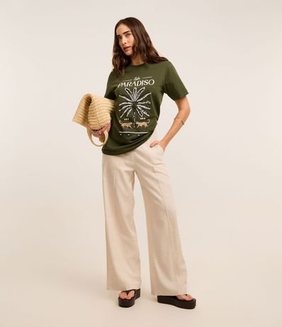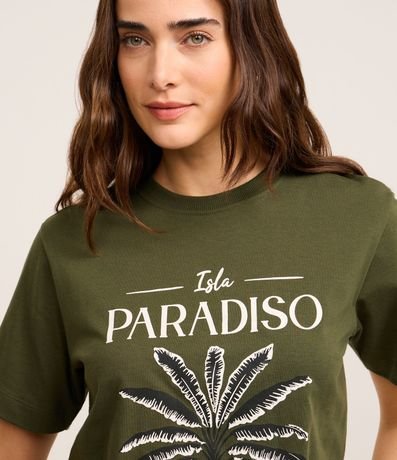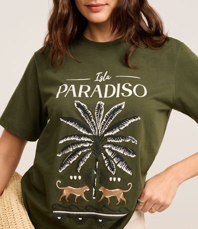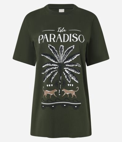 Ref: Camiseta t-shirt, toda confeccionada em algodão mais sustentável, com gola redonda e mangas curtas. Roupa tem lettering "Isla Paradise" estampado, mais ilustrações coqueiro e felinos logo abaixo. Peça fabricada através de boas práticas ambientais.
