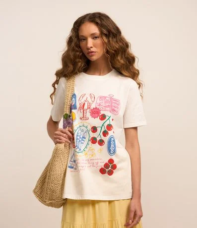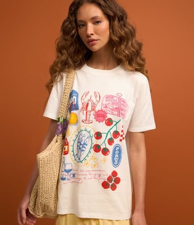 Ref: Camiseta t- shirt de mangas curtas confeccionada em algodão mais sustentável com gola redonda e estampa com ilustrações de culinário do Porto.