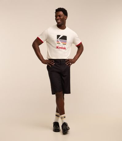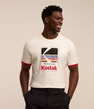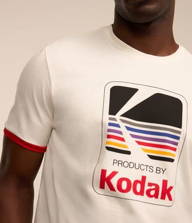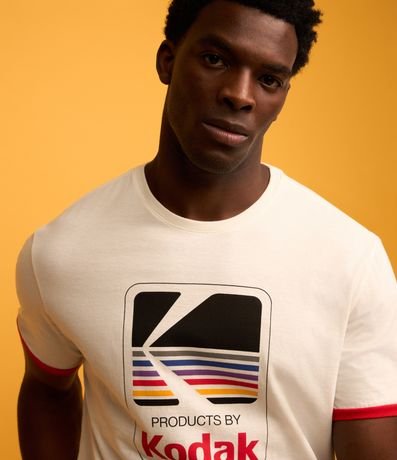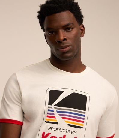 Ref: Camiseta masculina, confeccionada em algodão mais sustentável, gola redonda, mangas curtas. A peça consta com estampa do logotipo da marca Kodak, e detalhes nas mangas com cores vibrantes.