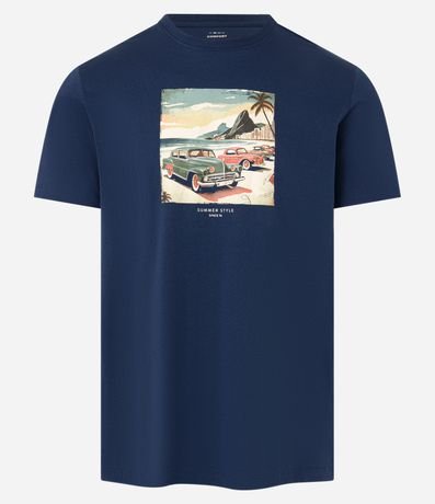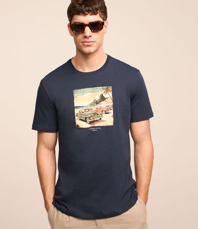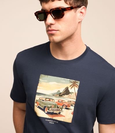 Ref: Camiseta masculina, confeccionada em algodão mais sustentável, gola redonda e manga curta. Peça contem estampa de carros clássicos no Rio de Janeiro, com referência aos anos 70.