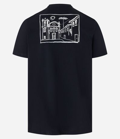 Camiseta masculina confeccionada em algodão mais sustentável com melhores práticas ambientais. Peça com gola redonda, manga curta e estampa de vila histórica.