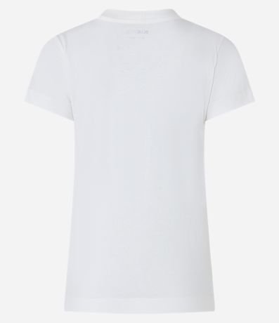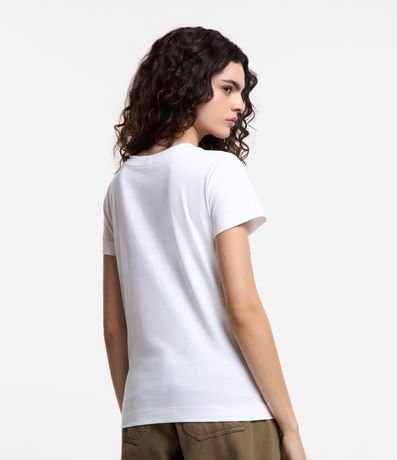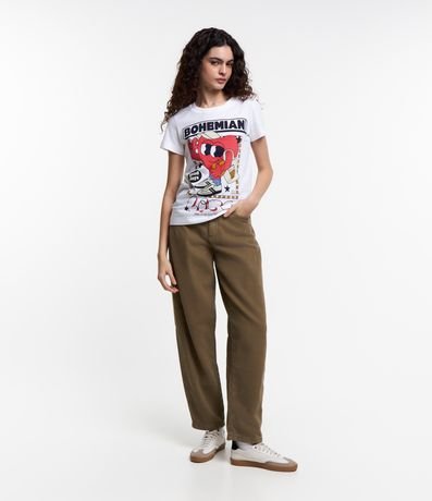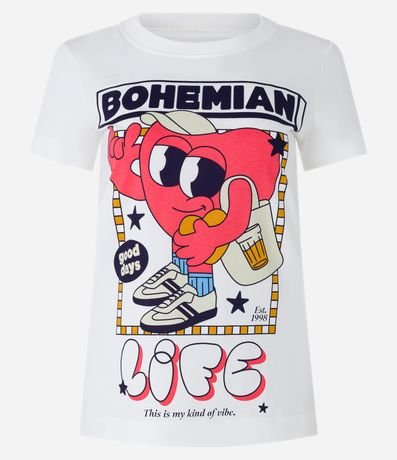 Ref: Camiseta feminina confeccionada em malha de algodão mais responsável, com gola redonda e mangas curtas. Possui estampa frontal divertida de coração boêmio, com ecobag de cervejinha e lettering "this is my kind of vibe".