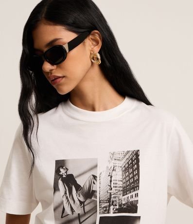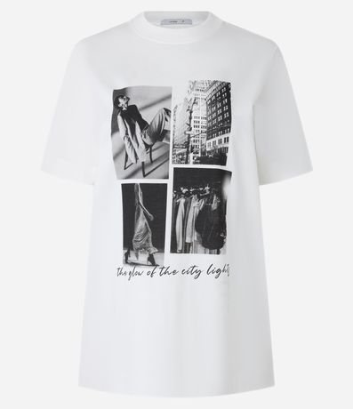Ref: Camisa de mangas curtas, confeccionada em algodão, com gola redonda e estamparia de fotoprints relacionados ao mundo da moda. Este produto possui algodão certificado em sua composição, sendo ambientalmente mais responsável.